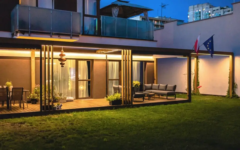 Zadaszenie tarasu z nowoczesnym oświetleniem.
