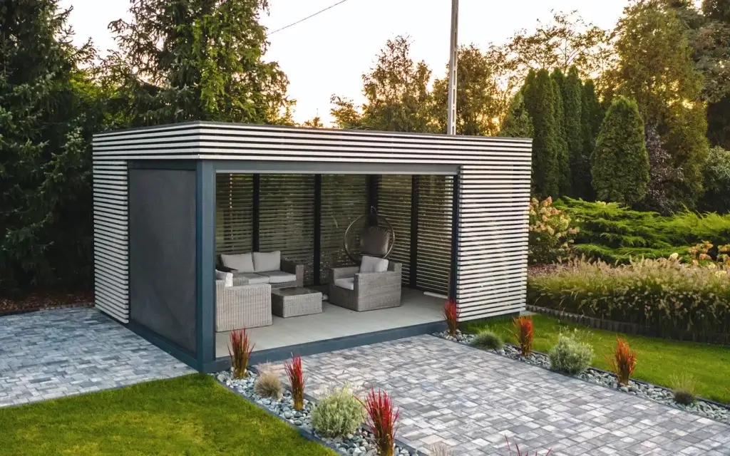 Nowoczesna pergola z dachem materiałowym sterowanym automatycznie.