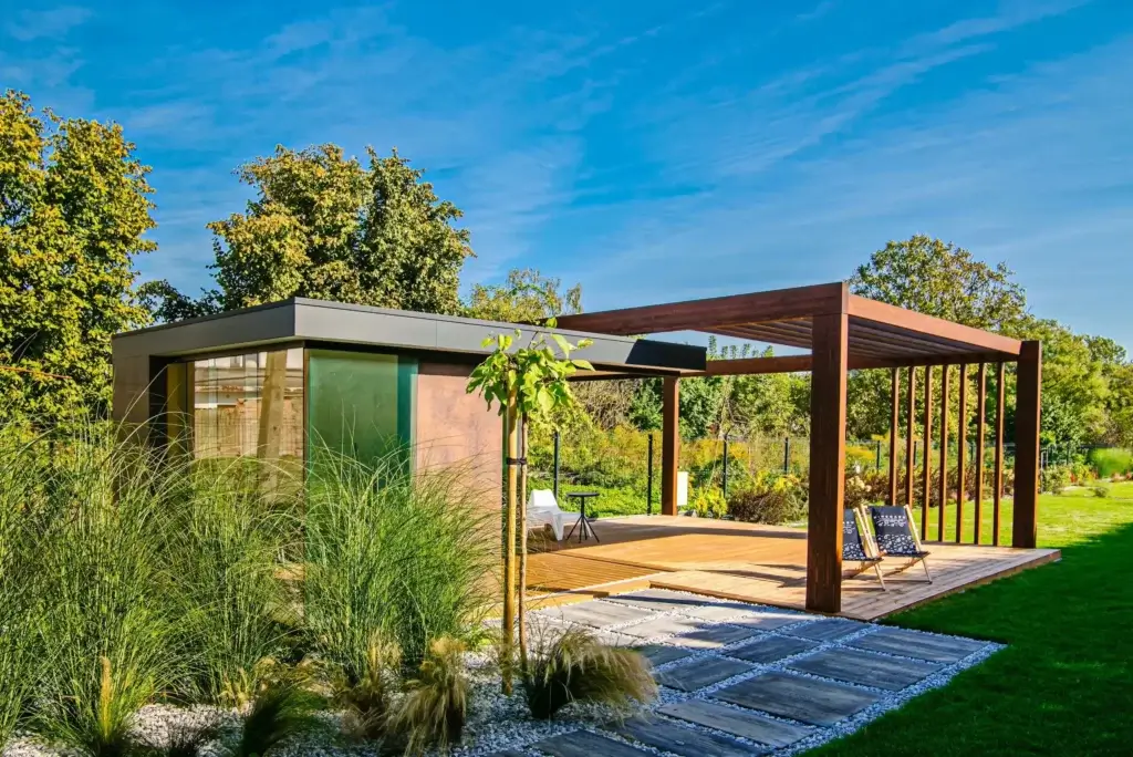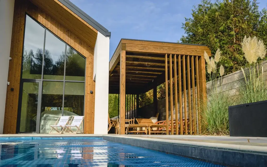 Nowoczesna altana ogrodowa z termodrewna to piękny projekt. Budynek altany postawiony przy basenie, doskonale wpisuje się w otoczenie ogrodu i zapewnia udany relaks.